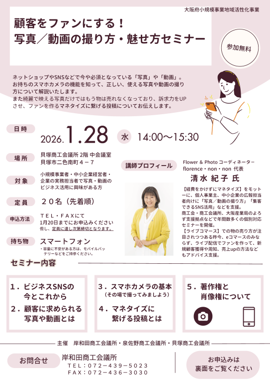 | 対象 | 小規模事業者・中小企業経営者・企業の実務担当者で写真・動画のビジネス活用に興味がある方 |